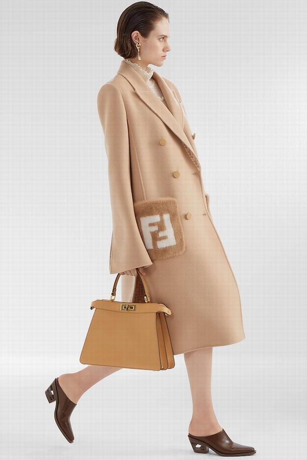 直筒版型中长款外套,下摆侧开衩。戗驳领,胸袋和贴袋设计。双排扣纽扣开合。米色双面羊毛布料材质,搭配同色系FF图案衬里。浅棕色貂毛口袋饰有白色FF镶饰。FF Karligraphy标志纽扣