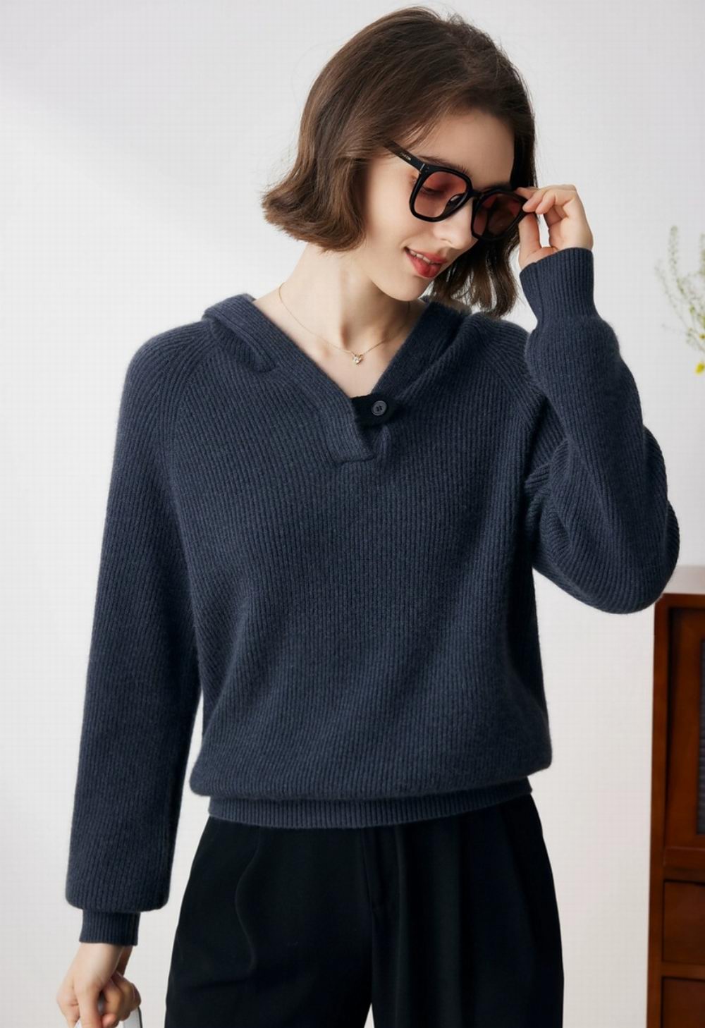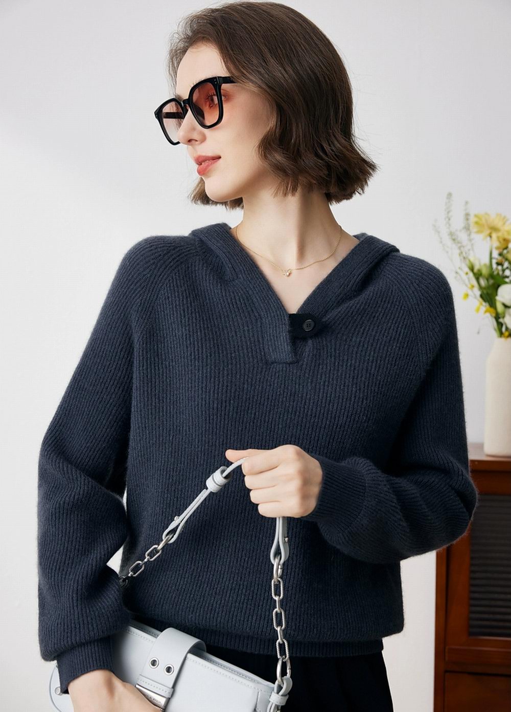 连帽纯色羊绒衫